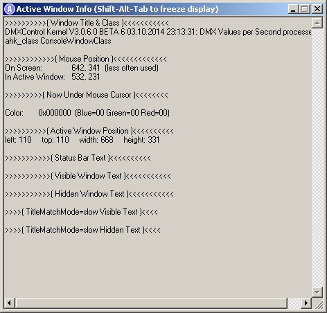 Für mein Screenshot-Tool https://github.com/DMXControl/Screenshot starte ich des öfteren den DMXControl Kernel. Leider kann AutoHotkey den Text in der Konsole nicht lesen, sondern nur den Fenstertitel. Ich kann also automatisiert nicht feststellen, wann der Kernel für weitere Aktionen bereit ist.