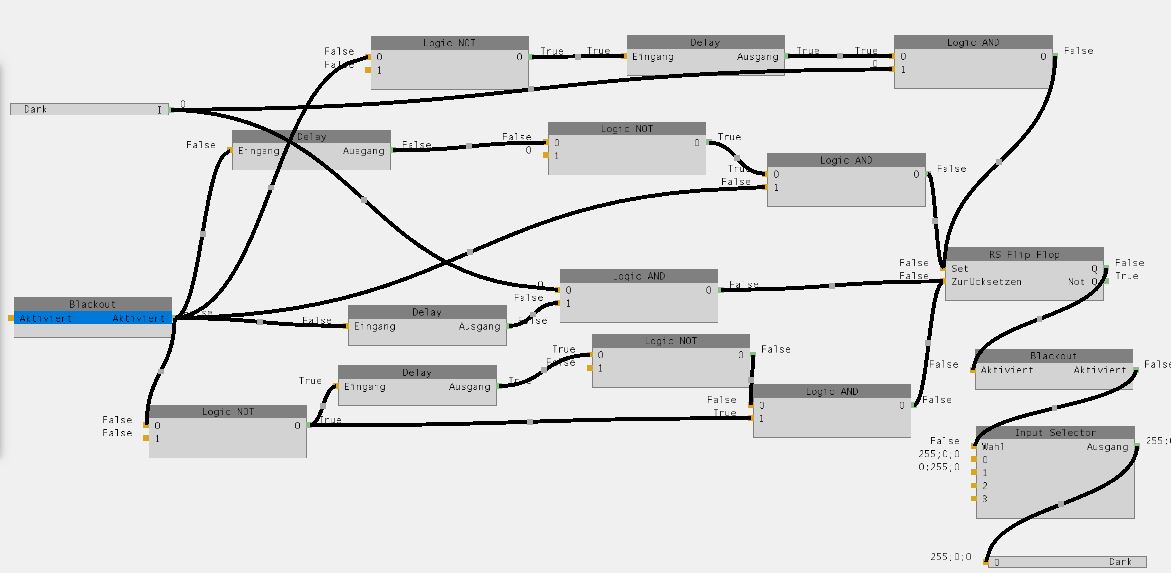Noch immer ist mir nicht klar warum der Binary switcher zwischen sofdesk button »Dark« on dem Blackout Baustein soll. Der Ausgang des Dark soft buttons ist doch Binär (0/1) und der Eingang des Blackouts auch. Allerdings habe ich im Forum gesehen, das dies oft gemacht wird zwischen Button und Binärem Eingang. Kann das jemand erklären ?