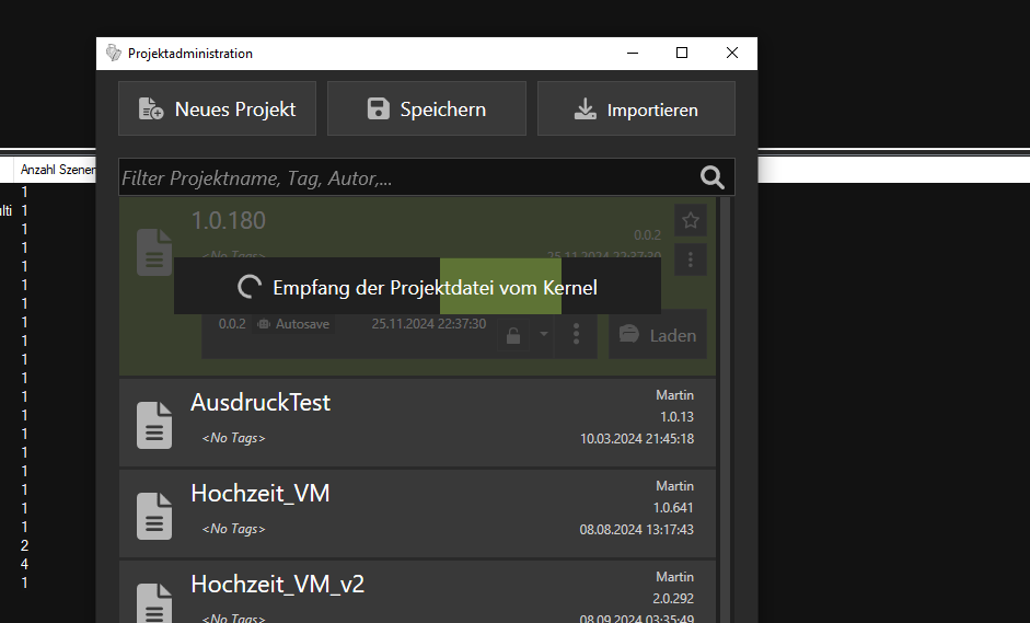FS#5265. Es wurden offenbar mehrere Szenenlisten im Projekt wieder gelöscht und beim Speichern des Projekts wurde hier nicht richtig gefiltert.Daher die Exportfunktion nun mit dem RC3 bitte nochmal mit unterschiedlich großen Projekten auf unterschiedlichen PCs sowohl mit einzelnen Versionen als auch mit dem gesamten Projekt prüfen.