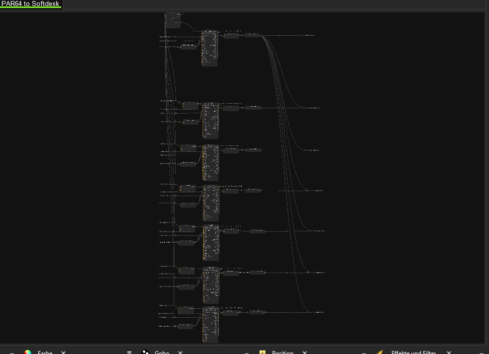 Und um noch einen Schritt weiter zu gehen (und einmal unabhängig von der Übersichtlichkeit im Connectionset) ;) Du stülpst hier DMXControl 3 eine kanalbasierte Herangehensweise über, die so gar nicht vorgesehen ist. Zwischen den Geräten bzw. deinem Softdesk und der DMX-Ausgabe passiert so viel im Programm um eben die Abstraktion hinzubekommen, dass man einfach beliebige Geräte mit beliebigen Eigenschaften ansteuern kann. Und diesen Aufwand gehst du gerade wieder in die andere Richtung, um alles wieder auf kanalbasiert umzubauen. Deutlich einfach wäre es, wenn du direkt mit den Geräten und deren Eigenschaften arbeitest. Das verstehen Neulinge auch (ich leite zur Zeit gerade eine DMXControl 3 Schulung für Schüler ab Klasse 5 und die kommen damit auch ganz gut zurecht :) ) und du musst dich nicht so verbiegen, alles hinzubekommen ;)