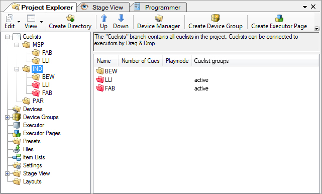 Bereits in der aktuellen Version 3.0.1 und auch schon in der Version 3 können im Project Explorer die Cuelists in Ordner und Unterordner geschoben werden. Auf diese Weise kann man ja ganz einfach Cuelists sortieren und Cuelists, welche zusammengehören sollen (z. B. Farbeffekte für LED-PARs), in einen Ordner packen.