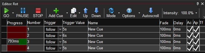 Man legt eine Cuelist mit mehreren Cues an, welche im Loop laufen. Nach dem ersten Durchlauf wird nur noch "Müll" angezeigt. S. Scrennshot 1 vom patme.