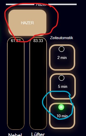 Im Softdesk den Button HAZER drücken: Geht dann die Lampe des "10min"-Buttons immernoch an? Ich muss nämlich auch hier immer erst einmal auf jeden Button drücken, damit dieser Fehler nicht mehr auftritt