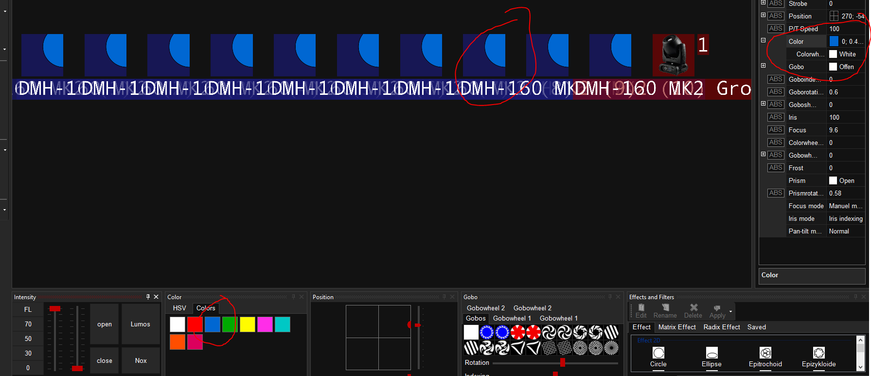 Das Problem wäre: Wenn man das nicht so macht, und eine Mischung aus MHs und z.B. RGB PARs markiert dann würden die RGB PARs aus bleiben, weil die ja kein Farbrad haben. Daher wird die "Farbe" übertragen und nicht die Auswahl auf dem Farbrad.
