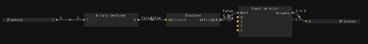 Noch immer ist mir nicht klar warum der Binary switcher zwischen sofdesk button »Dark« on dem Blackout Baustein soll. Der Ausgang des Dark soft buttons ist doch Binär (0/1) und der Eingang des Blackouts auch. Allerdings habe ich im Forum gesehen, das dies oft gemacht wird zwischen Button und Binärem Eingang. Kann das jemand erklären ?