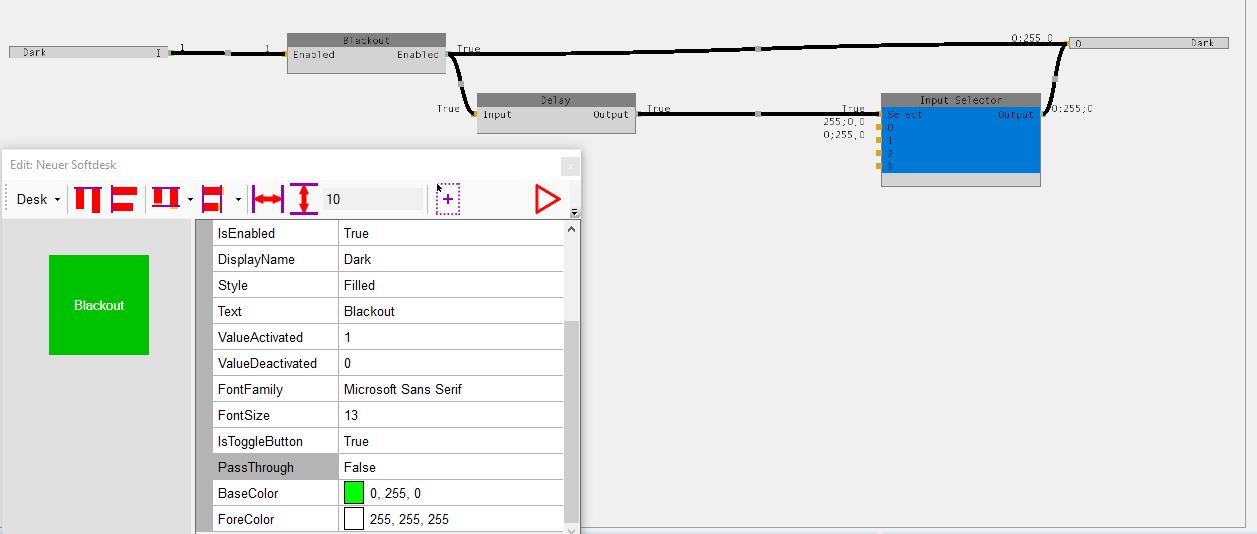 Dann stellt du im Softdesk den Button bei Toggle auf true und Legat ein Connectionset an, bei dem der Softdeskbutton auf den Eingang vom Blackout Knoten geht und dann vom Ausgang wieder zum Softdeskbutton.