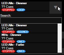 Status(RUNNING und STOPPED) und Play Mode sind bissel gequetscht… Evtl. mit Cues zusammenfassen. (Zeile 1 Name, Zeile 2 anzahl Cues+Status+Play Mode)Der Dropdown-Pfeil ist überproportional groß- Scroll Balken Sichtbar, wobei alle Einträge sichtbar sind