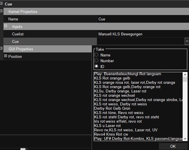 2.In den Einstellungen des cue-Nodes kann man zuerst die Cuelist und dann die Cue auswählen. Es sind dann aber ALLE Cues aus dem Projekt vorhanden. Es wäre hier angebracht, nur die Cues anzuzeigen, die in der ausgewählten Cuelist vorhanden sind.