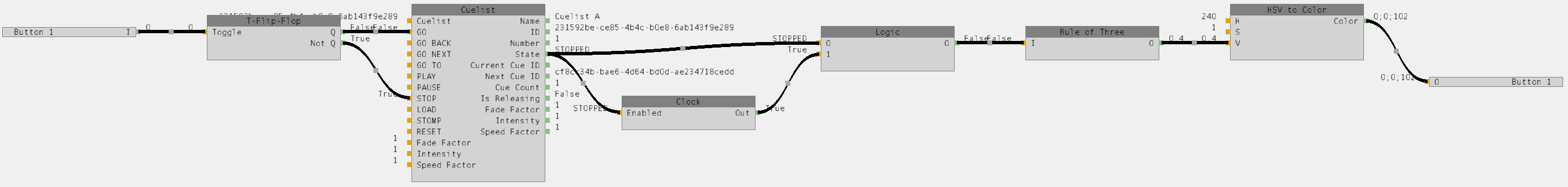 Reell war jedoch mein Überlegung, irgendetwas zu schaffen, wo man selbst eine Logik aus vorhandenen Nodes zusammenbauen und diese Logik mehrfach wiederverwenden kann, wie zum Beispiel die Nodes zwischen dem Output des Cuelist-Nodes und des Softdesk-Buttons im angehangenen Beispiel.