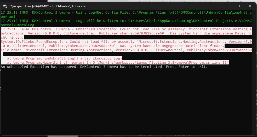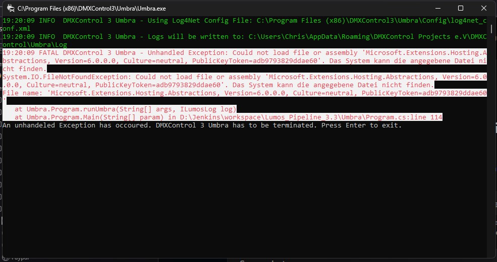 Nach Installation von DMX Control 3.3.0 RC 5 wurde der DMX Control Launcher gestartet. Beim Starten von DMX Control 3.3.0 startet auch die Umbra und es erscheint im Umbra Log angehängte Fehlermeldung.