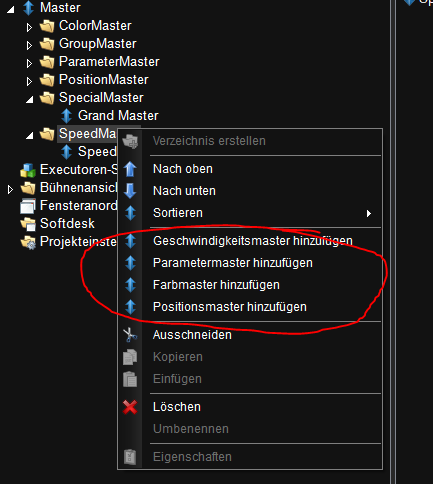 Im Projektexplorer → Master → z.B. SpeedMaster, Rechtsklick darauf öffnet das Kontextmenu.