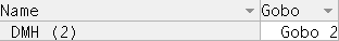 Wähle ich bei einem Gerät mit zwei Goborädern (hier Futurelight DMH-160) von beiden Goborädern je ein Gobo aus, erscheint im Programmer die folgende Anzeige statt des Klartext “1: Gobo 2, 2: Gobo 7” inklusive des zugehörigen Icons (siehe Bild 1).