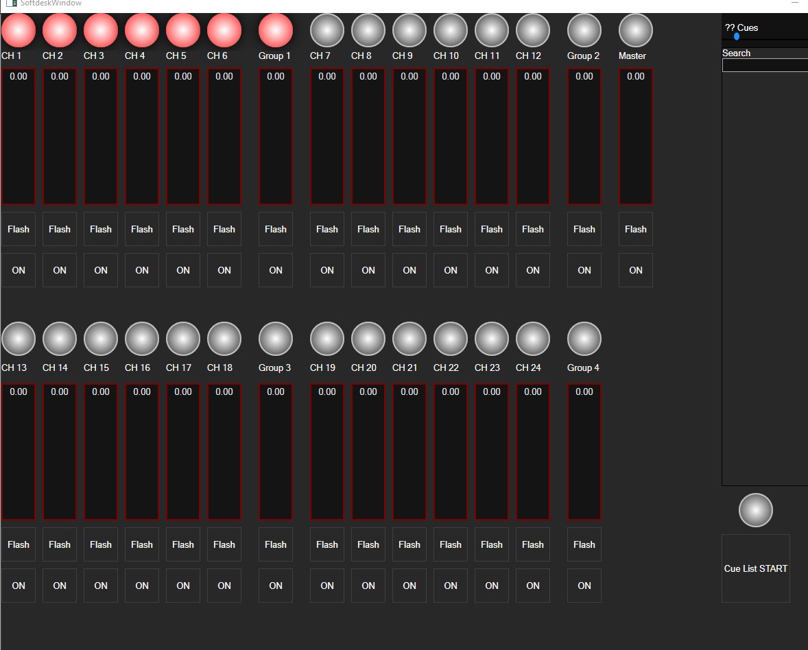 Geplant ist 24CH frei via Softdesk frei zu zuweisende Dimmer. Je nach Gerät Kanal zuweisung verbunden in dadurch Variable Gruppen mit einem Master über allem und Einzelkanal vorzug vor Cuelist.