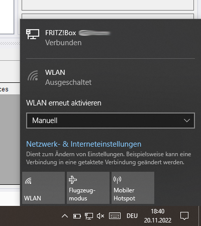 - Variante 1: Meine Laptops sind per WLAN verbunden (Adresszuweisung per DCHP). Ich stelle eine kabelgebundene Verbindung zum gleichen Netzwerk her (Sowohl feste IP-Adresse über Zuteilung vom Router als auch DCHP) und deaktiviere die WLAN-Verbindung über den Infobereich in der Taskleiste. Diese Variante kann ich sowohl unter Windows 10 als auch Windows 11 nachvollziehen. (Zugehörige Logs unter Windows 10 siehe DMXControl3Logs_20221120_184500.zip)