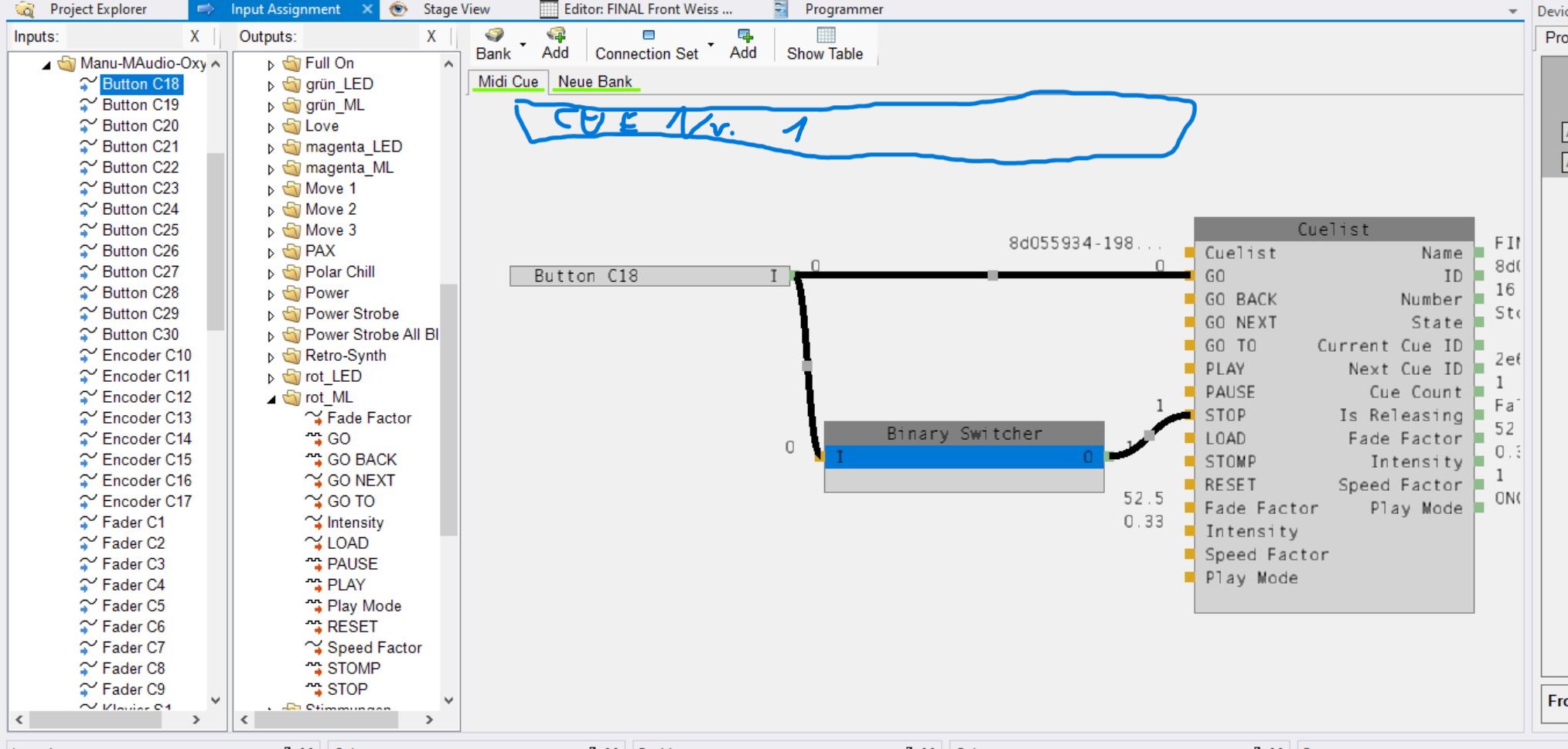 Ich hatte jetzt schon mehrfach, dass ich mich im Input Assignment verheddert habe, und nicht mehr wusste, wie die Zeile jetzt heisst bzw. welchen Input ich mit welchem Cue verbinden wollte. Ein Titel im Fenster, in dem man den Namen sieht, würde da viel helfen.